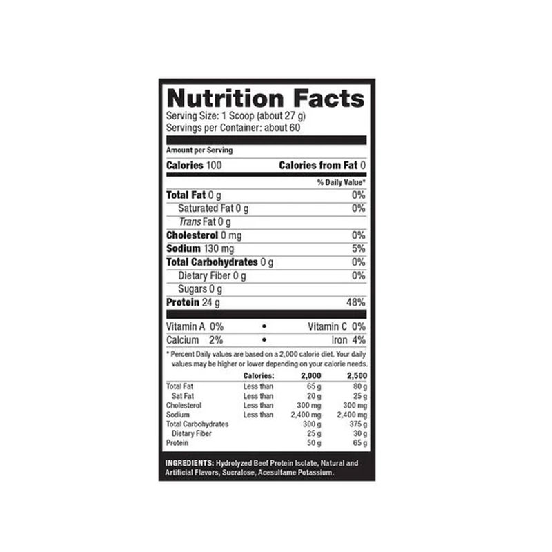 Ultimate Nutrition ha querido diseñar una proteína hidrolizada totalmente libre de grasas y de carbohidratos, con un 85% de proteínas en cada dosis, que tiene como objetivo aportar más proteína que 3,5 veces que un filete de ternera sin cocinar.