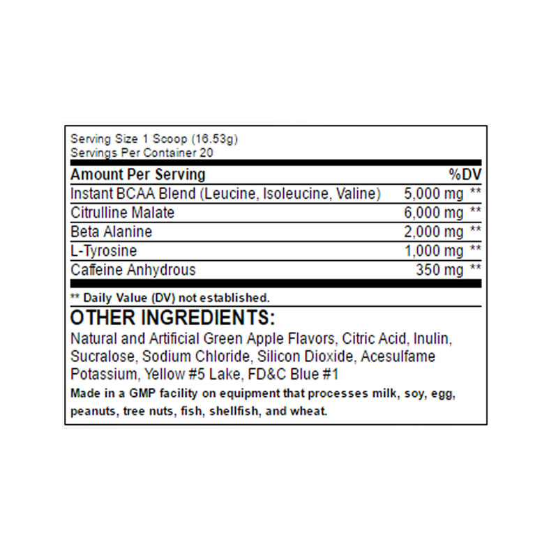 Citrulina malato (~6 g) — ayuda al flujo sanguíneo y al bombeo muscular.